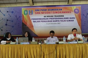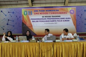 In House Training (IHT) kali ini mengambil topik “Pengembangan Profesionalisme Guru dalam penulisan Karya Ilmiah”. Ketua Panita ibu Evi Yanti, ST., menyampaikan bahwa setelah IHT ini akan ditindaklanjuti yang sifatnya operasional yakni peserta IHT diberikan kesempatan melakukan simulasi membuat komik sederhana dengan menerapkan di PMM. Melalui simulasi ini diharapkan para guru dapat mengetahui praktik langsung implementasi kurikulum merdeka yang nantinya akn disesuaikan dengan mata pelajaran masing-masing. Selain itu juga hari ke 3 Guru harus melakukan pembuatan karya ilmiah berikut dengan pembimbingannya yang akan difasilitasi SMKN 1 Singkawang yang dibimbing langsung oleh Ibu Rini Susilowati, Sos.,M.Pd. Harapannya ini merupakan bagian dari proses pembelajaran untuk pengetahuan dalam arti luas dan secara teknis karya itu dengan bangga akan dipublish di PMM, dan semua bermanfaat bagi penulis maupun pembaca.