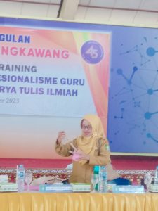 Ibu Rini Susilowati, Sos.,M.Pd, menyampaikan materi dengan judul Fungsi Karya Ilmiah dalam Pengembangan Karier Berkelanjutan yang akan di di masukan di bukti karya sehingga bisa berbagi pengalaman yang sangat praktis berperan sebagai guru pengerak