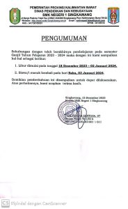 Sehubungan dengan telah berakhirnya pembelajaran pada semester Ganjil Tahun Pelajaran 2023-2024 maka dengan ini kami sampaikan khusus kelas X & XI, Khusus kelas XII (Siswa PKL) tidak ada Libur semester harus mengikuti aturan DUDI